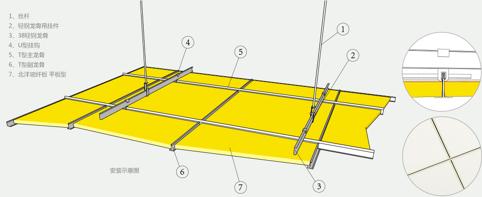 明架龍骨安裝,安裝后板面與龍骨平行。拆卸方便。
